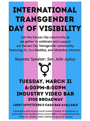 The Mid-America GLCC board of directors is proud to be co-sponsoring the first local observance of the International Transgender Day of Visibility on Tuesday, March 31 from 6:00 to 8:00 pm at Industry Video Bar, 3700 Broadway in the Uptown Theater Building.