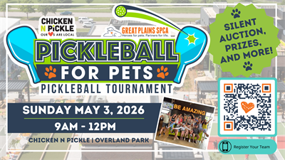 On May 3, 2026, join us at Chicken N Pickle in Overland Park from 9:00 AM – 12:00 PM for an exciting tournament packed with fun, competition, and furry friends—all in support of Great Plains SPCA and the 7,000+ pets we help each year.