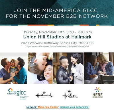 Join the Mid-America GLCC for the November B2B Network on Thursday, November 10th, 5:30 to 7:30 pm at the Union Hill Studios at Hallmark, located at 2820 Warwick Trafficway, Kansas City, MO 64108 (right across the street from the Union Hill Cemetery).